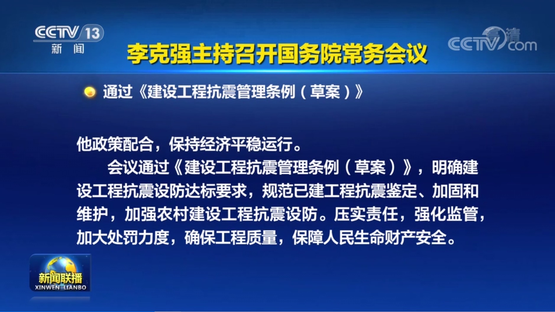 国务院总理李克强主持召开国务院常务会议,会议通过《建设工程抗震管理条例(草案)》